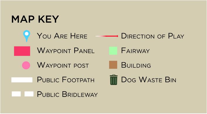 This map shows the layout of the Sunningdale Golf Course, with the route of the Public Footpaths and Public Bridleways marked in white, along with the location of the Halfway House cafe and the bins to deposit dog waste. The map also shows the white-painted Waymarker posts that will help with navigation and orientation.