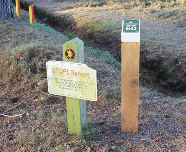 The footpath here crosses multiple golf fairways. Travelling north, the golfers will be hitting from your right. Going south, the first fairway has balls coming from the right, and the second has balls coming from the left. Please take maximum care in this area.